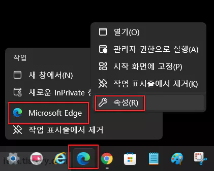 우클릭할 경우 위의 캡처 이미지와는 다르게 여러개의 항목이 보일 수도 있는 데, 작업 표시줄에 고정되어 있는 아이콘과 동일한 아이콘이 있는 줄을 다시 한번 우클릭합니다. 이때, 속성이라는 항목이 보인다면 속성을 클릭합니다.