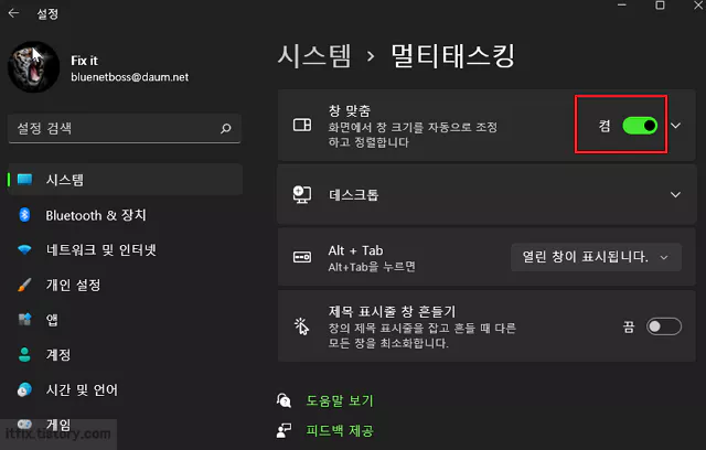 윈도우 11 가장자리로 끌면 화면 분할되는창맞춤 기능 제거하기