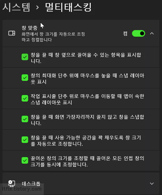 창 맞춤 기능을 그대로 두고 세부적인 설정만 조금 조절하고 싶은 경우에는 창 맞춤 기능을 그대로 켜 둔 상태에서 하위 메뉴를 열어 개별 기능만을 선택적으로 끌 수 있습니다.
