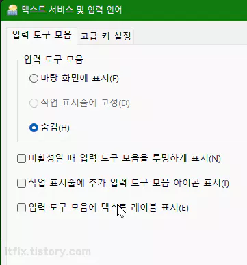 2. 보통 1번까지만 설정해도 되지만, 좀 더 확실하게 하려면 바로 아래의 입력 도구 모음 옵션을 클릭한 다음 텍스트 서비스 및 입력 언어 설정 창이 열리면 입력 도구 모음은 숨김으로 체크하고, 하단의 모든 옵션은 체크 표시를 해제합니다.