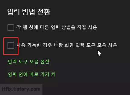 1. '사용 가능한 경우 바탕 화면 입력 도구 모음 사용'의 체크 표시를 해제합니다.