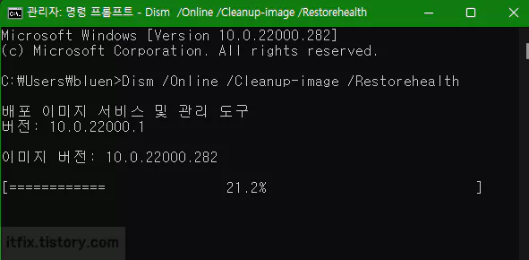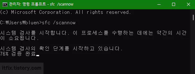 윈도우 시스템 파일의 손상 또는 복원에 관련된 두 가지의 명령어를 이용해 손상 여부를 검토하고 자동 수정하는 방법입니다.