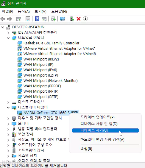 윈도우 장치 관리자에서 디스플레이 어댑터를 우클릭한 다음 디바이스 제거를 누릅니다.