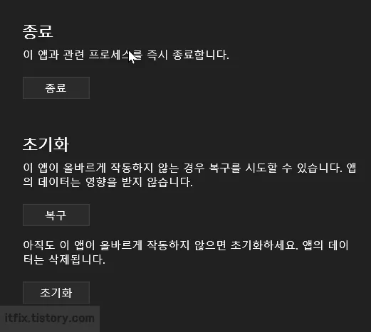 고급 옵션 페이지에서 종료-복구, 종료-초기화 과정을 모두 진행해 봅니다.