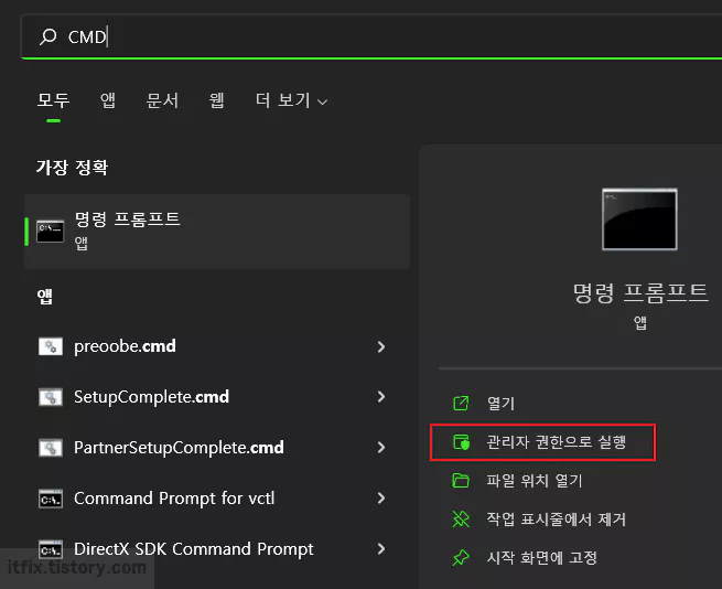 윈도우 작업 표시줄 왼쪽의 검색 상자에 CMD라고 입력한 다음 관리자 권한의 명령 프롬프트를 실행합니다.
