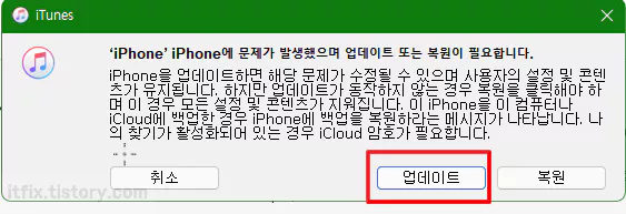 PC 화면의 아이튠즈 화면에서는 이미 복원 또는 업데이트를 이용한 복구 화면이 팝업 되어 있을 것입니다. 이때, 반드시 초기화를 의미하는 복원이 아닌 업데이트를 선택해야 아이폰 속의 데이터를 지킬 수 있습니다.
