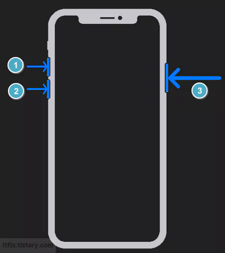 검은색 화면에서 아이폰이 아무런 반응을 하지 않거나 프리징(멈춤) 현상을 보이는 경우에는 볼륨 버튼 상단 짧게 누르고, 하단 짧게 누르고 난 다음 마지막으로 우측 버튼을 길게 누르는 데, 우측 버튼은 애플의 사과 로고가 나타날 때까지 길게 누릅니다.