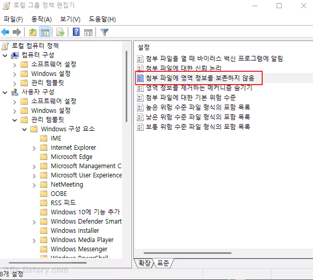 로컬 그룹 정책 편집기에서 사용자 구성 > 관리 템플릿 > Windows 구성 요소 > 첨부 파일 관리자 항목으로 들어갑니다. 첨부 파일 관리자를 클릭한 다음 우측의 설정 창에서 '첨부 파일에 영역 정보를 보존하지 않음'을 더블 클릭합니다.