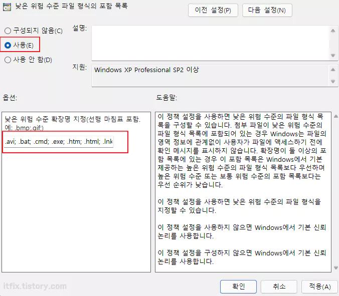 이 항목을 사용으로 선택한 다음 아래의 확장자들을 복사하여 붙여 넣기 한 다음 적용 및 확인 버튼을 눌러 줍니다.