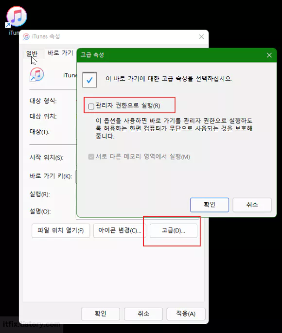 속성 창에서 바로 가기 탭을 선택한 다음 고급 버튼을 누르고 '관리자 권한으로 실행'에 체크합니다.