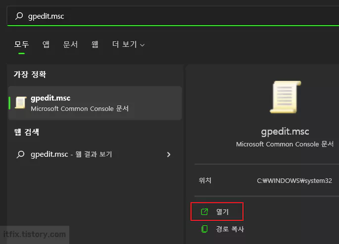 윈도우 작업 표시줄의 검색 상자에 gpedit.msc라고 입력한 다음 로컬 그룹 정책 편집기가 검색되면 열기를 누릅니다.