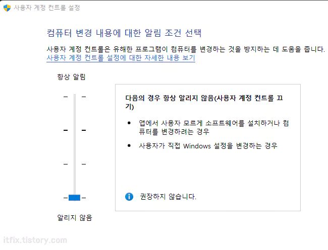 사용자 계정 컨트롤 설정 창이 열리면 알림 수준을 가장 아래쪽으로 내려 알림 창이 뜨지 않도록 설정합니다.