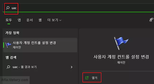 작업 표시줄의 검색 상자에 UAC를 입력한 다음 검색 결과창에서 '사용자 계정 컨트롤 설정 변경'을 클릭합니다.