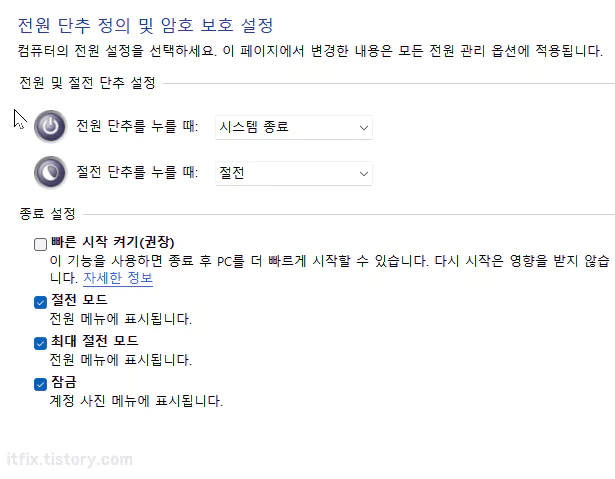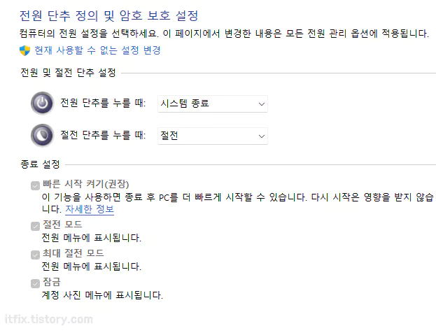 아래의 이미지에서와 같이 빠른 시작 켜기가 체크 표시되어 있을 경우에는 이를 해제해야 합니다.