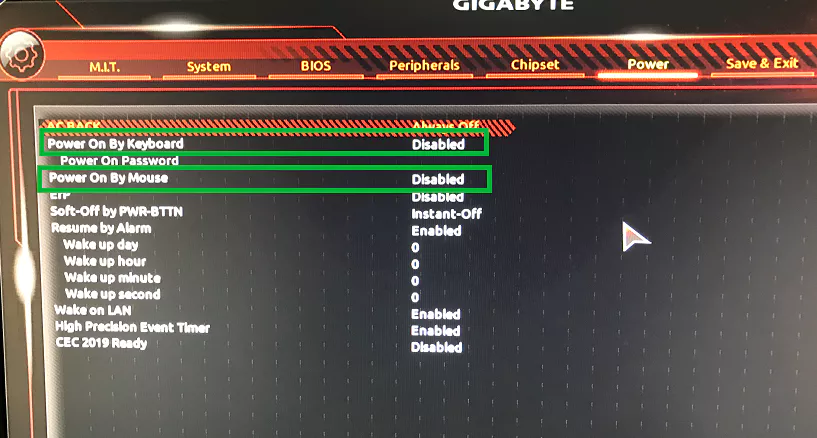 Power on by keyboard 및 Power on by Mouse 옵션을 모두 Disabled로 설정해 두어야 전원이 꺼진 상태에서 마우스나 키보드의 이벤트로 인해 전원이 켜지는 일이 발생하지 않습니다.