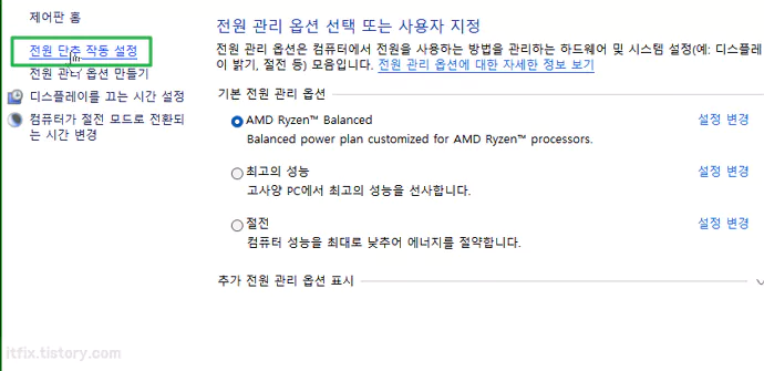 제어판의 전원 옵션으로 들어간 다음 '전원 단추 작동 설정'을 클릭합니다.