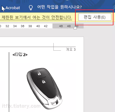 이후, 처음에 열릴 때에는 제한된 보기라는 형식으로 열리게 되는 데 이 상태에서는 문서 편집이 불가능하므로, 편집 사용 버튼을 눌러 완전히 편집 가능한 문서 형식으로 만들어 줍니다.