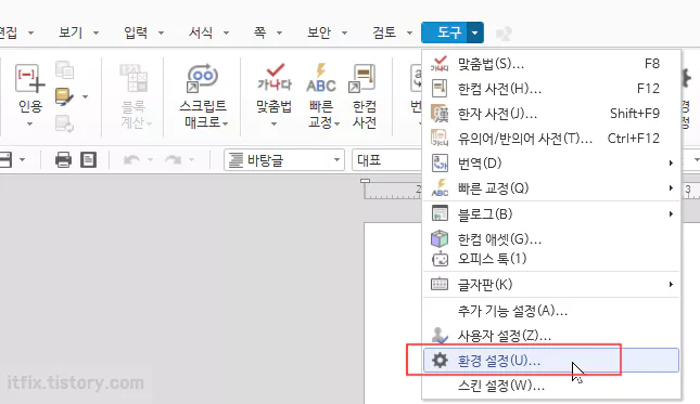 자동 저장 기능을 해제하기 위해서는 한글 워드를 연 다음 상단 메뉴에서 도구 > 환경설정으로 들어갑니다.