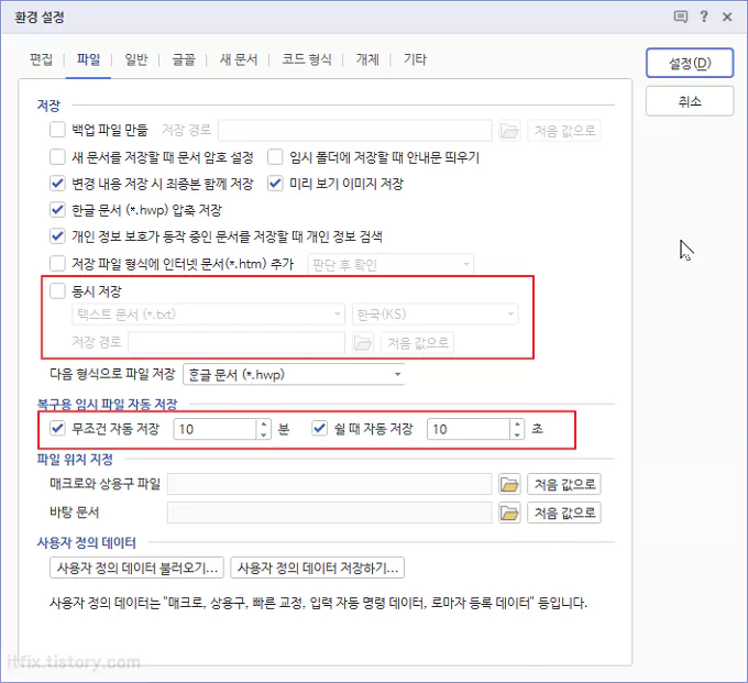 한컴 한글 워드의 환결 설정 창이 열리면 파일 탭을 선택한 다음 동시 저장의 체크 표시를 해제한 다음 아래쪽에 있는 복구용 임시 파일 자동 저장 부분도 모두 체크 해제하면 자동 저장 기능이 제거됩니다.
