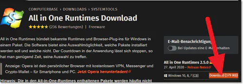 올인원 라이브러리 패키지 배포 사이트로 이동한 다음 독일에서 제작된 All in One Runtimes를 다운로드한 다음 설치해 줍니다. 이 패키지에는 런타임 뿐만 아니라 넷프레임워크, 자바, MS 실버라이트 등과 관련된 요소들도 포함되어 있는 통합 패키지입니다.