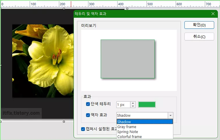 단색 테두리의 색상 및 두께, 액자 효과의 종류 등을 지정해 줄 수 있으며, 가장 하단에 있는 '캡처 시 설정된 효과 자동 적용'에 체크 표시하면 캡처하는 순간 자동으로 세부 설정한 테두리가 캡처 이미지에 입혀지게 됩니다.
