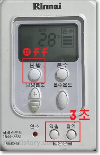왜냐하면 린나이 RBMC-28 보일러 모델은 하단부 버튼이 외출과 예약이 아니라 외출과 절약으로 이루어져 있고 예약 버튼이 존재하지 않기 때문입니다. 또한 홈페이지 설명인 예약 버튼을 절약 버튼으로 유추해 외출과 절약 버튼을 3초 이상 눌러도 반응하지 않게 됩니다. 왜냐하면 일단 보일러의 가동을 끈 다음 두 개의 버튼을 눌러야 하는데 이에 대한 언급은 없기 때문입니다.