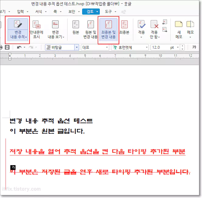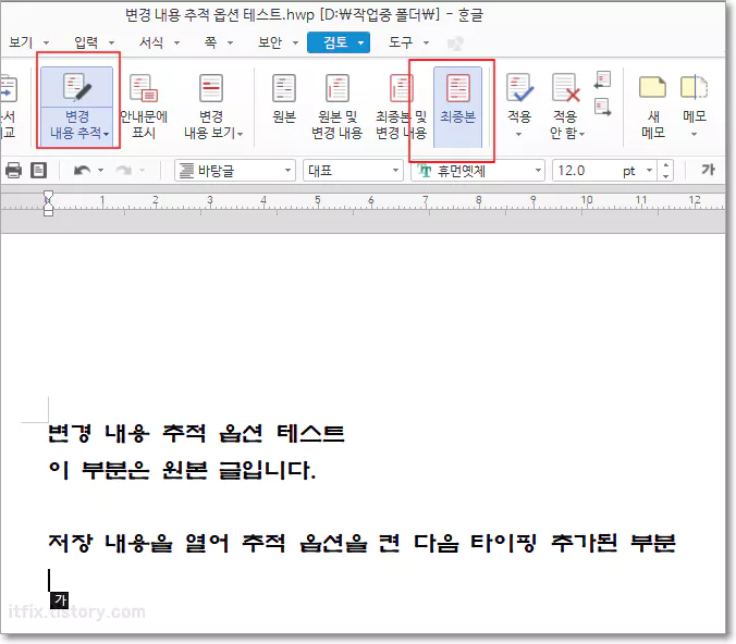 변경 내용 추적 기능을 켠 상태에서 타이핑 현재의 최종본 형태를 보여줍니다.