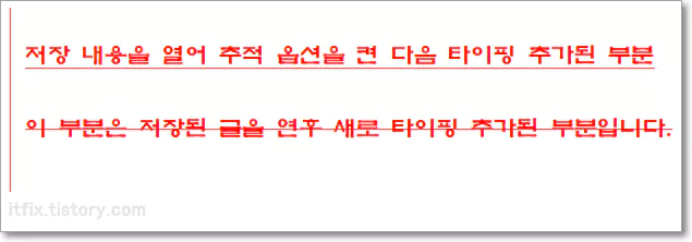 빨간 글씨에 빨간 밑줄 부분은 타이핑이 추가된 부분을 나타내며, 빨간 글씨의 중앙을 관통하는 빨간 평행선이 그어진 부분은 타이핑 추가되었다가 편집 도중 삭제된 부분을 의미합니다.
