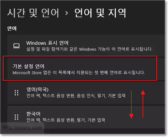 화살표로 표시한 이유는 기본 설정 언어 항목 아래에 있는 언어들은 모든 윈도우 버전에서 단순한 마우스 드래그 등으로 그 순위를 조절할 수 있게 설정되어 있기 때문입니다.
