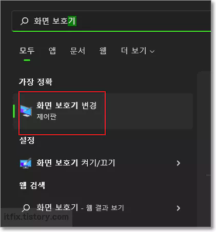 윈도우 작업 표시줄의 돋보기 아이콘 모양의 검색 상자에 화면 보호기라고 타이핑한 다음 화면 보호기를 클릭합니다.