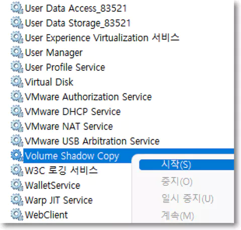 서비스 앱이 열리면 Volume Shadow Copy를 우클릭한 다음 시작을 눌러 줍니다. 다시 한번 Volume Shadow Copy를 마우스 우클릭한 다음 속성 > 자동으로 설정합니다.