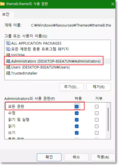 이번에는 중간의 편집 버튼을 누른 다음 Administrators를 선택한 다음 하단의 항목에서 허용 부분에 모든 권한을 체크해주고 적용 및 확인 버튼을 눌러 줍니다.