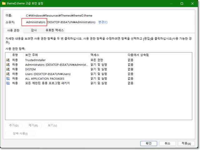 이제 고급 보안 설정 창에서 상단의 소유자 항목이 Administrators로 나오게 되는 데 하단의 적용 및 확인을 눌러 줍니다. 확인 버튼 창이 또 나오면 한번 더 눌러 줍니다. 여기까지 진행하면 모든 창이 닫힌 상태입니다.