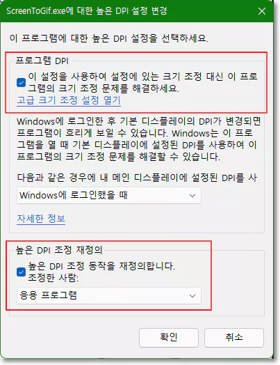 높은 DPI 설정 변경 창이 열리면 '프로그램 DPI' 부분과 '높은 DPI 재정의' 두 부분을 모두 체크한 다음 확인을 눌러 적용시켜 줍니다. 이후 특정한 앱에 대한 수정 사항이 적용되도록 PC를 재시작한 다음 문제 해결 여부를 검토합니다.