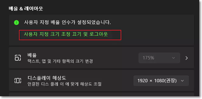윈도우 설정 > 시스템 > 디스플레이 > 배율 및 레이아웃에서 사용자 지정 배율이 설정되어 있는 경우 '사용자 지정 크기 조정 끄기 및 로그아웃'을 클릭해 기본값인 100%가 설정되도록 조정합니다.