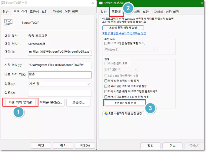 확장자가 Exe 파일 형식인 실제 메인 실행 파일을 마우스 우클릭한 다음 속성 > 호환성 > 높은 DPI 설정을 차례대로 클릭합니다.
