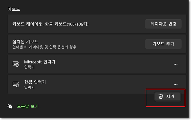 설치된 키보드 항목중 'Microsoft 입력기'를 제외한 한컴 입력기 또는 옛 한글 입력기 등의 이름을 가진 이름이 다른 모든 입력기를 3점을 누른 다음 제거 버튼을 클릭해 제거해 줍니다. 윈도우 10의 경우에도 동일하게 제거해 주면 됩니다.