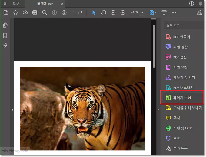이제 작업의 마지막 단계로 하나로 병합된 PDF 문서에서 불필요한 페이지들은 제거하거나 페이지의 순서를 바꾸거나 하는 등의 페이지 정렬 작업을 진행해야 합니다. 우측의 메뉴 중 '페이지 구성'을 클릭하면 페이지 편집 창이 열립니다.