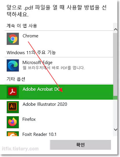 팝업 창이 열리면 PDF 파일을 클릭할 경우에 열리길 원하는 프로그램을 선택해 준 다음 확인을 클릭해 줍니다.