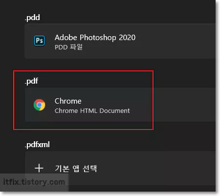 다음으로 나타나는 파일 유형별 기본값 선택 페이지에서 사이드바를 내려 .PDF 항목을 찾습니다. 여기서 .PDF 확장자가 크롬 브라우저로 연결되어 있는 것을 확인할 수 있습니다.