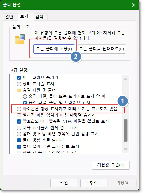 폴더 옵션에서 보기 탭을 선택한 다음 고급 설정에서 '아이콘은 항상 표시하고 미리 보기는 표시하지 않음' 옵션을 체크한 다음 적용 버튼을 눌러 줍니다. 다시 해당 옵션의 체크 표시를 해제한 다음 적용 버튼을 눌러 줍니다.