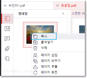 새로운 PDF 파일에서 복사해 갈 페이지를 마찬가지로 썸네일 창에서 우클릭한 다음 복사를 클릭합니다.