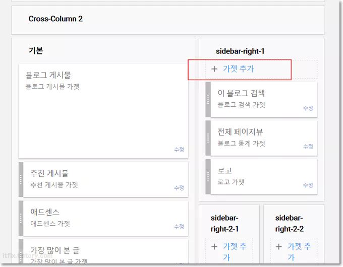 블로거 관리 페이지에서 해당 블로그를 선택한 다음 레이아웃을 선택하고 사이드바 메뉴에서 가젯 추가를 눌러 줍니다.