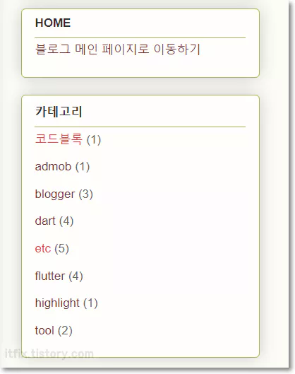 이 중에서 HOME을 제외한 Fluter, tool, no code 등을 자신의 블로그에서 사용할 주요 카테고리 제목으로 사용하시면 됩니다.