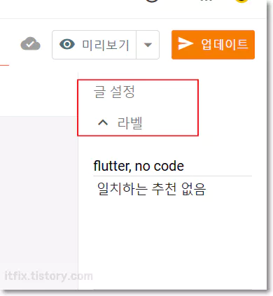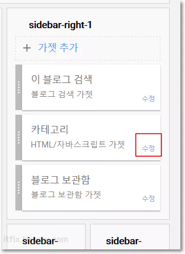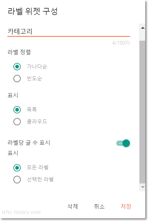 추후에 카테고리를 추가할 경우 이 위젯의 수정을 누른 다음 추가하는 라벨 코드만 더해주면 됩니다.