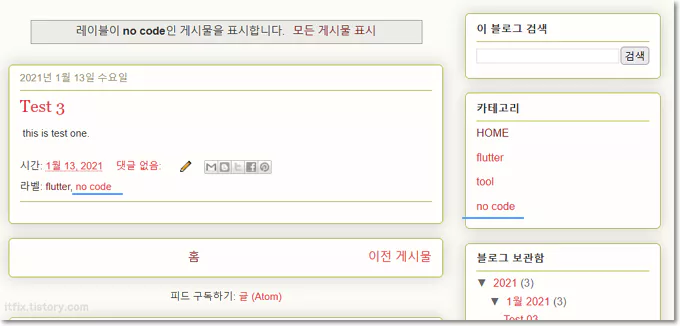 작업이 끝나고 저장한 다음 블로그를 새로고침하면 아래와 같이 사이드바에 추가된 카테고리 메뉴가 보이게 되며, 클릭하면 해당 라벨이 있는 글들이 나오게 됩니다.