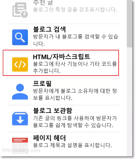 가젯 추가 버튼을 누르면 미리 준비된 삽입 가능한 가젯들이 보이게 되는 데, 이 중에서 HTML/자바스크립트 가젯을 클릭해 추가합니다.