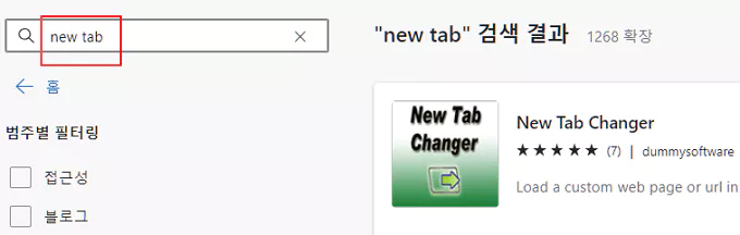 엣지의 추가 기능 페이지에서 영어로 'new tab'라고 입력하면 가장 첫 번째로 나오는 New Tab Changer를 설치해 주도록 합니다.