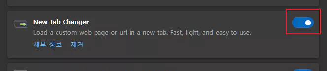 다시 한번 우측 상단에 있는 퍼즐 조각 모양의 확장 아이콘을 클릭한 다음 'New Tab Changer'를 켜주도록 합니다.
