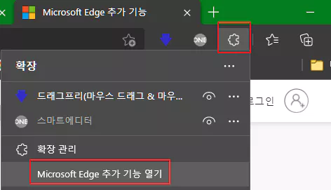 엣지의 우측 상단에 있는 아이콘들 중 퍼즐 조각 모양의 확장 아이콘을 클릭한 다음 'Microsoft Edge 추가 기능 열기'를 클릭합니다.